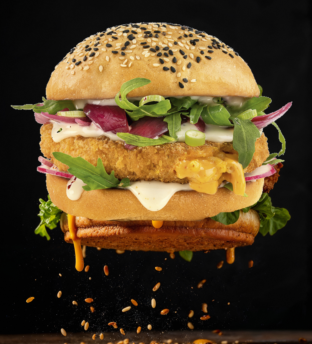 5 gebackene Käsestangen in krosser Knusperpanade mit feiner Butternote, einem Hauch Knoblauch, würzigen Kräutern, serviert mit Dip (G=Wz,Ro,M)